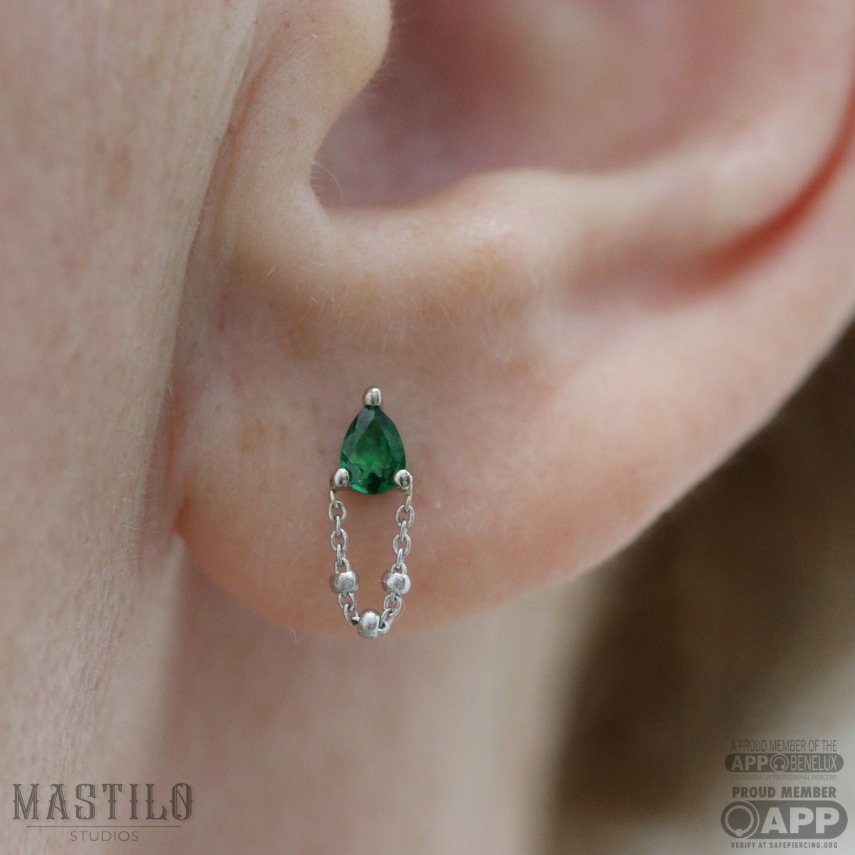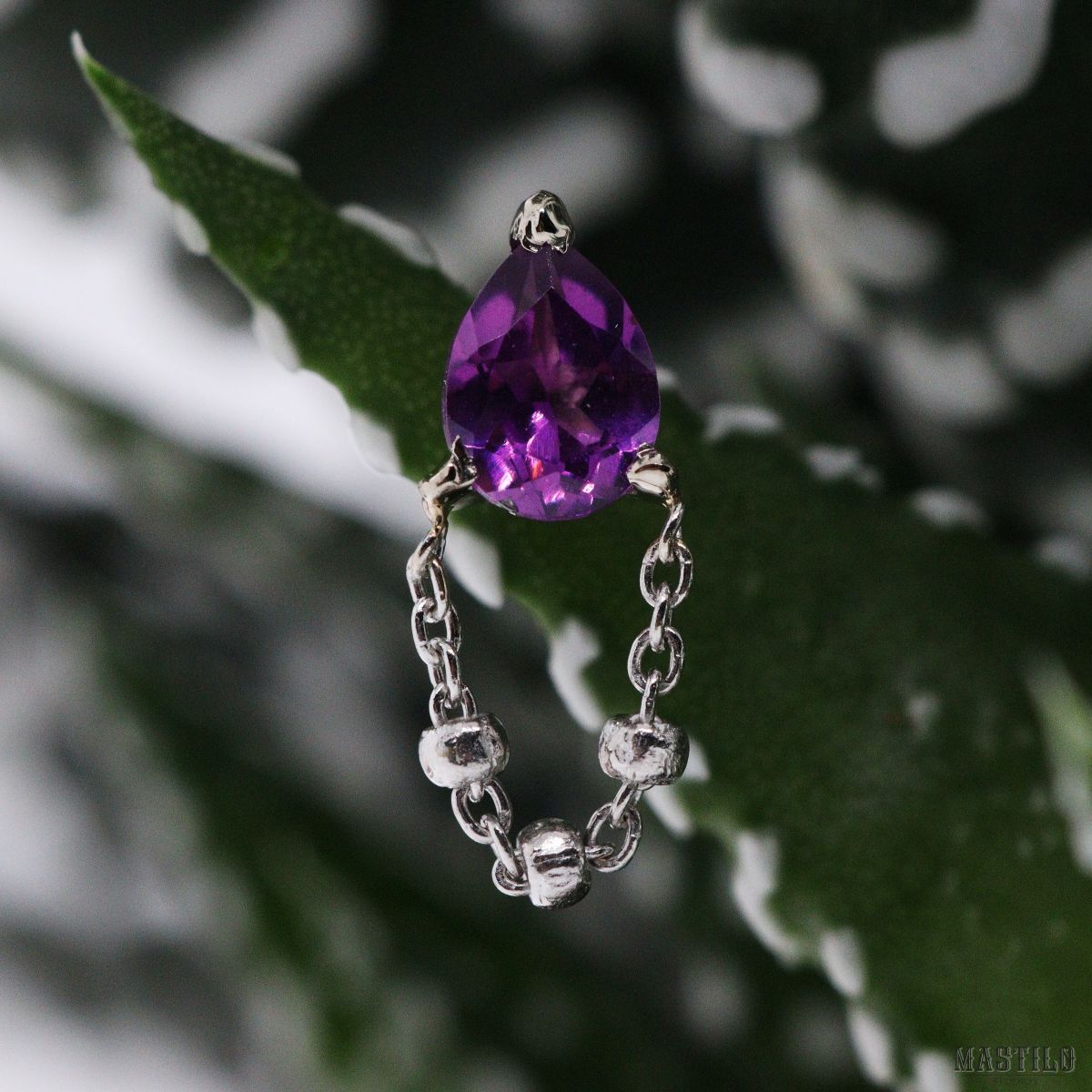 Een peer-geslepen Rhodoliet granaat in een prong-zetting. Ketting onder de steen, voorzien van drie beads.