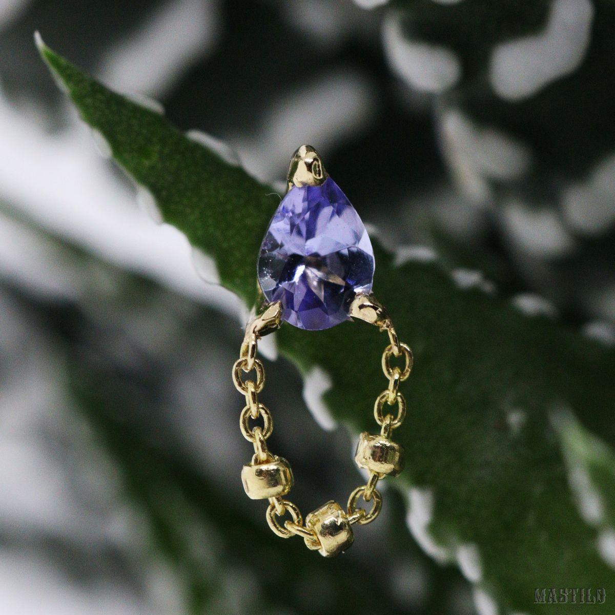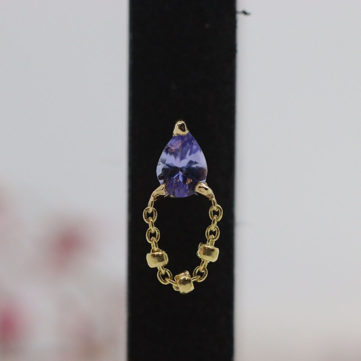 Een peer-geslepen Tanzaniet in een prong-zetting. Ketting onder de steen, voorzien van drie beads.