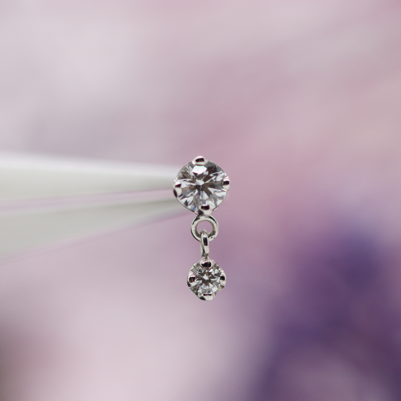 2mm witte zirconia in een 4-prong zetting met nog een 1.5mm zirconia verbonden met een korte cable chain.