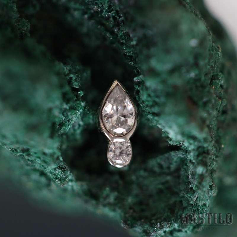 2mm x 3mm peer geslepen witte zirconia met een 1.5mm Brilliant geslepen ronde witte zirconia. De 18k massief gouden Icon end is zoals alle sieraden van Anatometal met veel aandacht en precisie gemaakt, met de hand gepolijst en van topkwaliteit die levenslang gegarandeerd wordt.