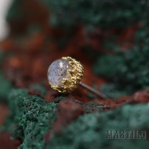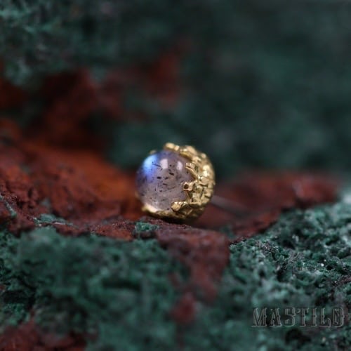 De 18k massief gouden King end is zoals alle sieraden van Anatometal met veel aandacht en precisie gemaakt, met de hand gepolijst en van topkwaliteit die levenslang gegarandeerd wordt. De prachtige cabochon geslepen Labradoriet edelsteen heeft een afmeting van 3mm.