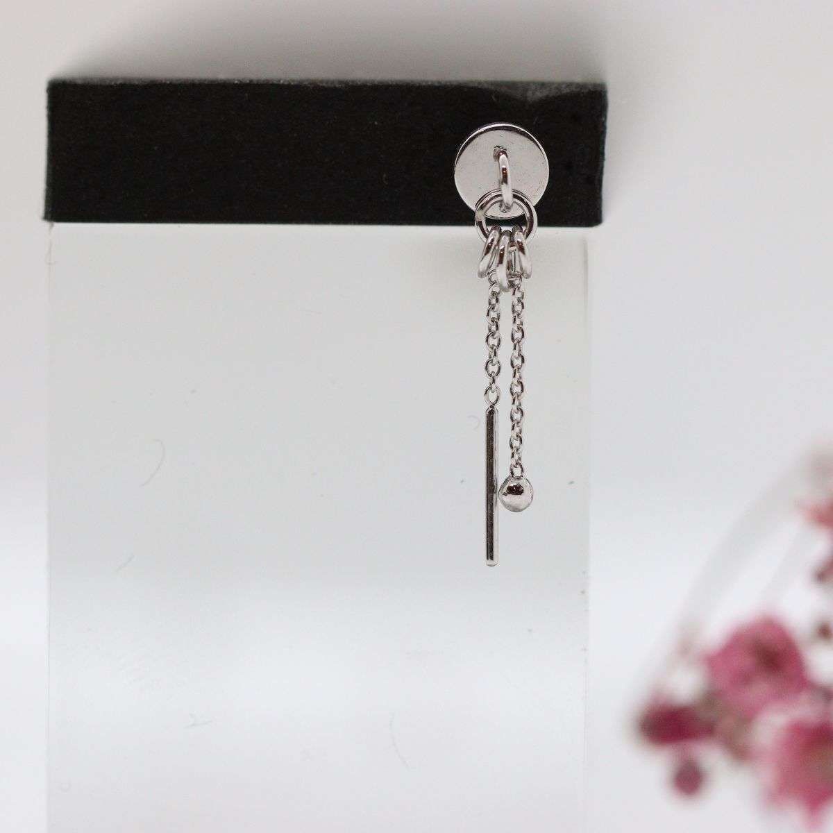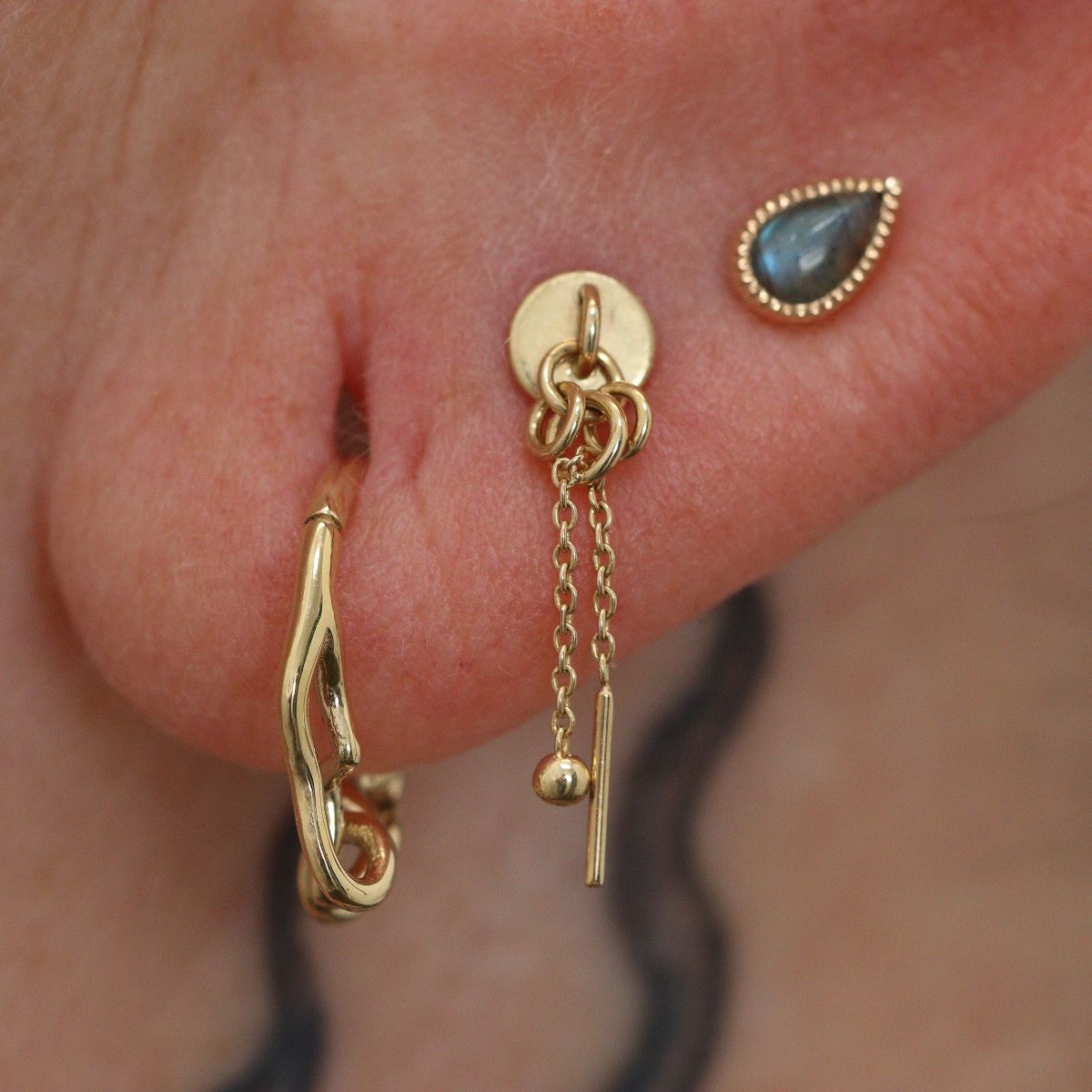 Een disc van 5mm houdt meerdere losse gouden ringetjes en twee kettingen die ook los bewegen.
