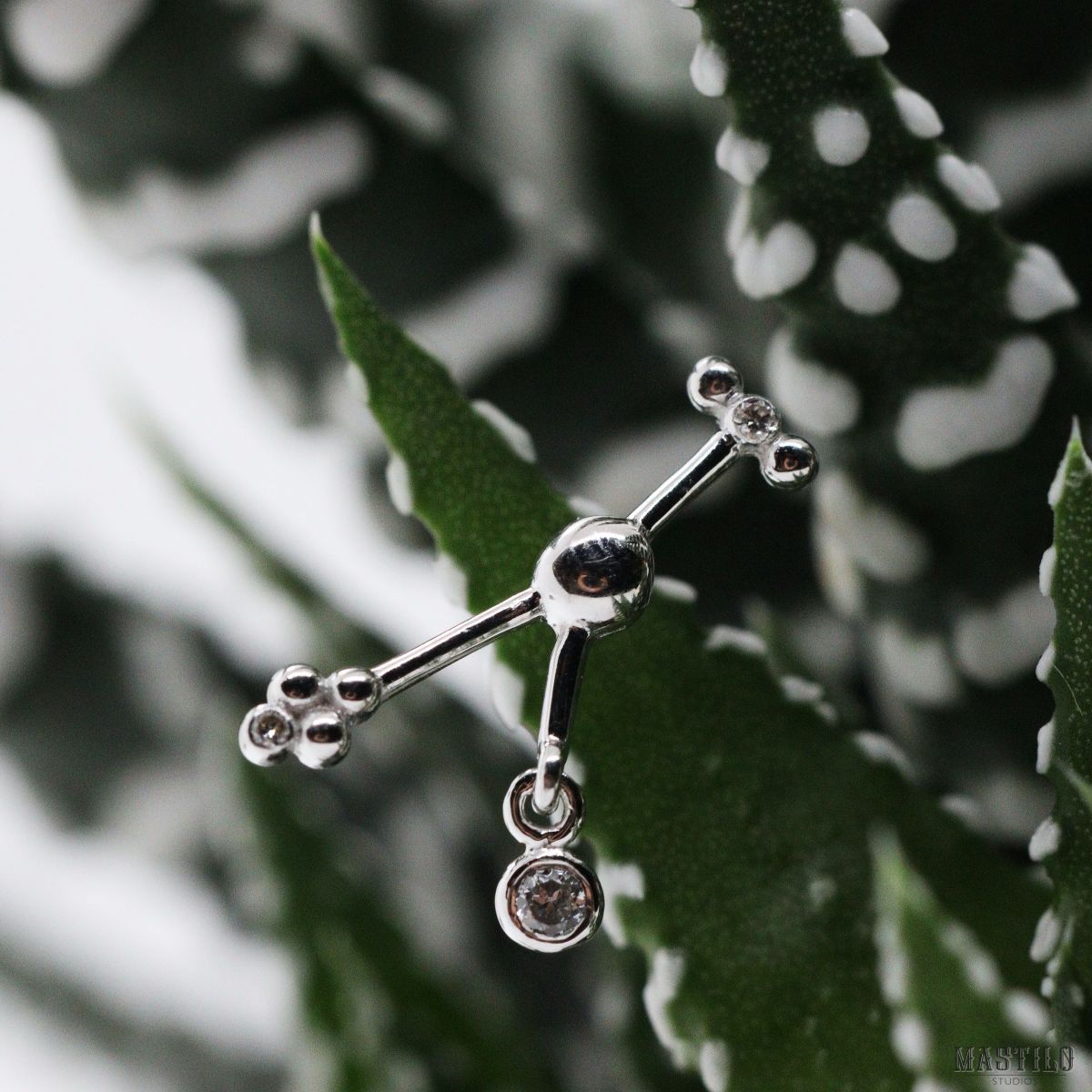 Vanuit de dome in het midden van het sieraad lopen drie dunne bars met aan de uiteindes drie verschillende designs:
