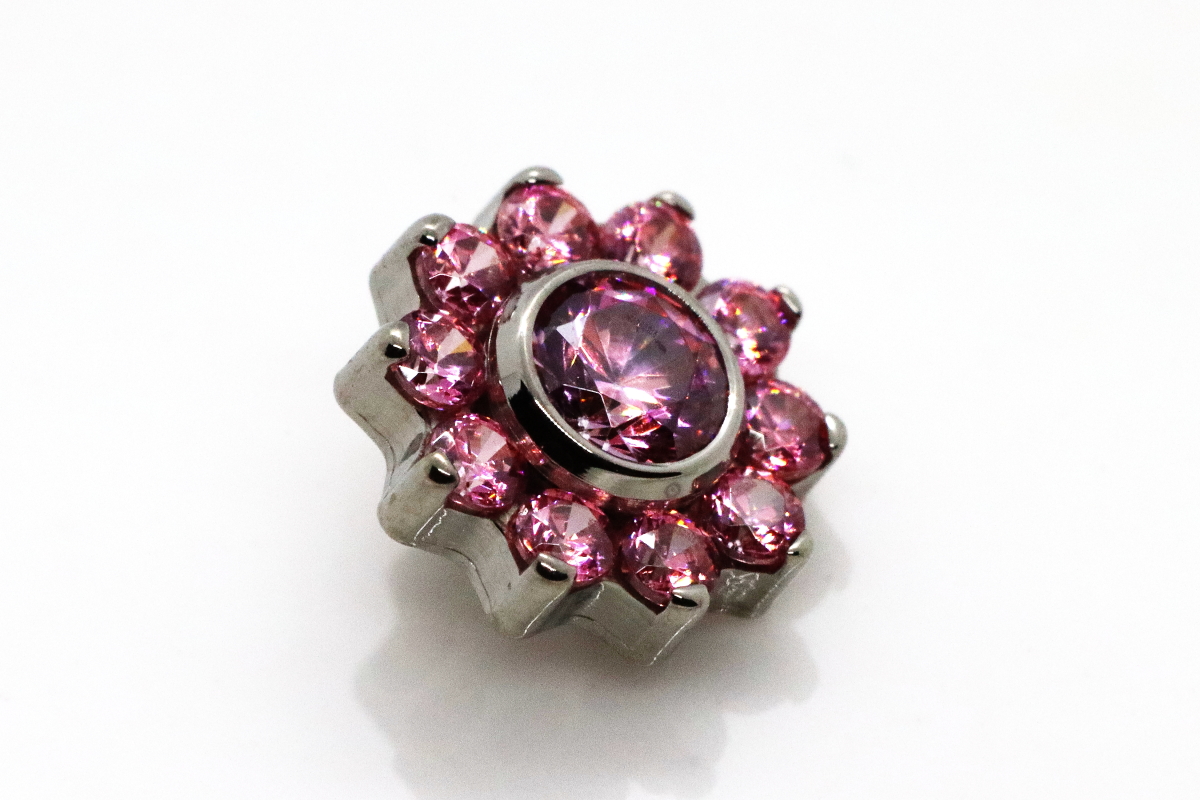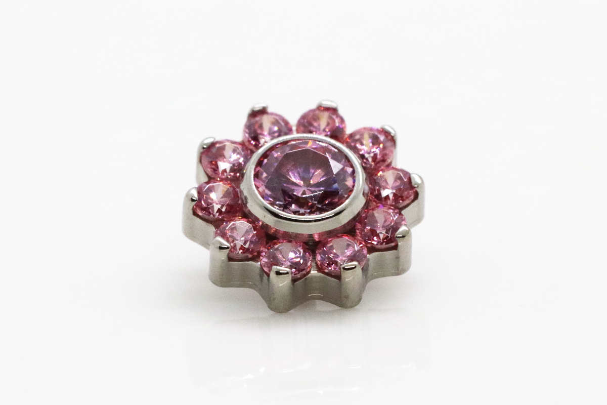 Deze roze flower end is van ASTM F-136 implant grade titanium en zoals alle sieraden van Industrial Strength met veel aandacht en precisie gemaakt, met de hand gepolijst en van topkwaliteit die levenslang gegarandeerd wordt. De steen in het midden van de bloem is 3mm en de blaadjes eromheen zijn 1.5mm per steen. De totale grootte van deze end is 6.4mm.