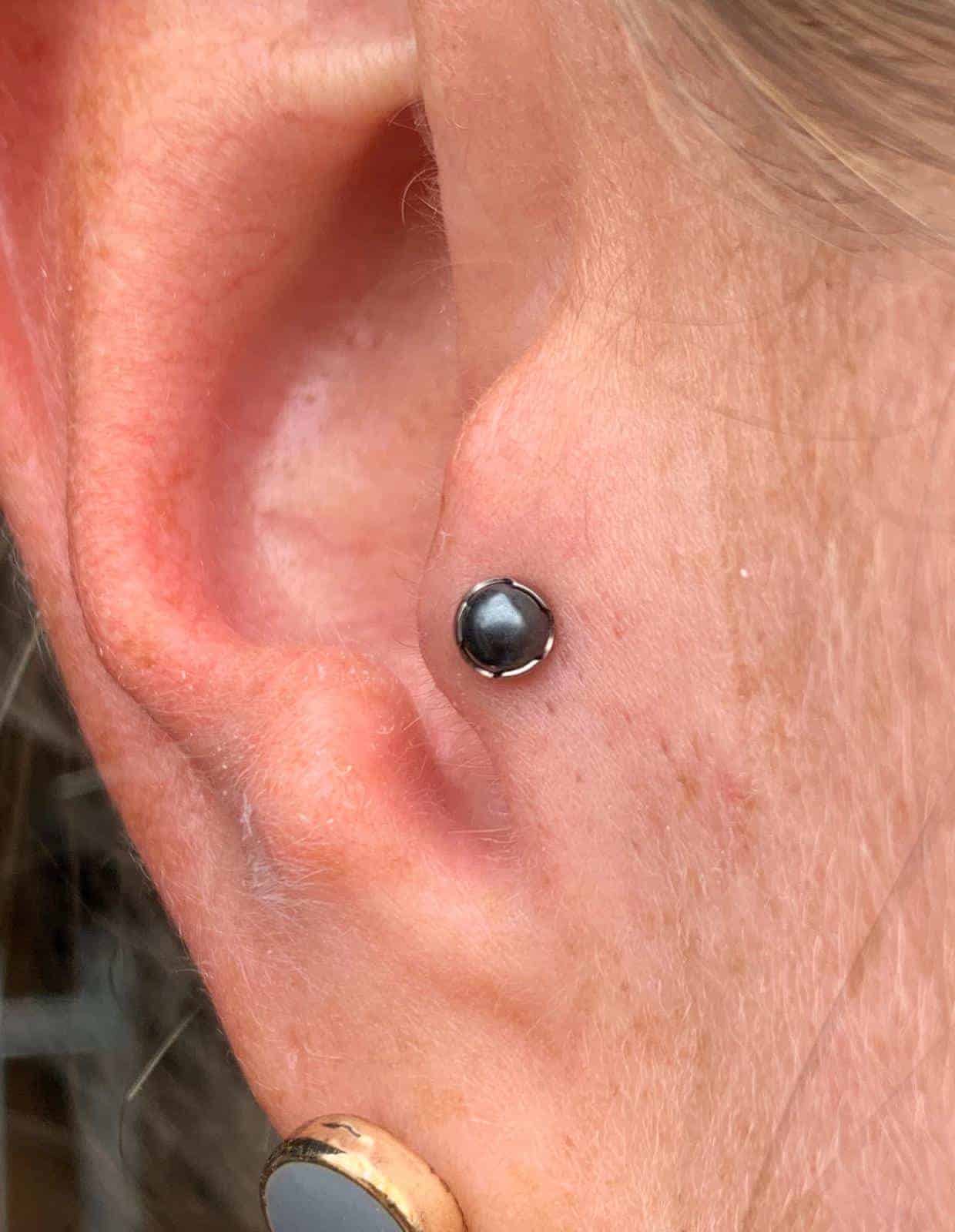 Titanium prong-set gem end met een 3mm cabochon geslepen hematiet edelsteen. De setting is van ASTM F-136 implant grade titanium en zoals alle sieraden van Anatometal met veel aandacht en precisie gemaakt, met de hand gepolijst en van topkwaliteit die levenslang gegarandeerd wordt.