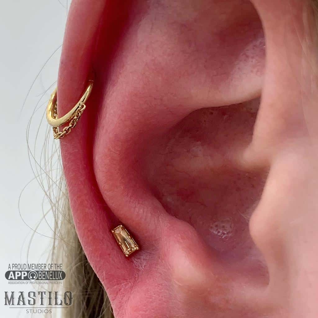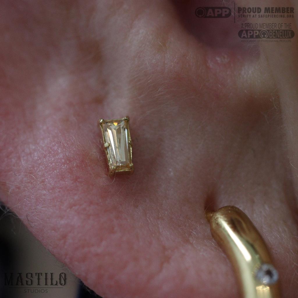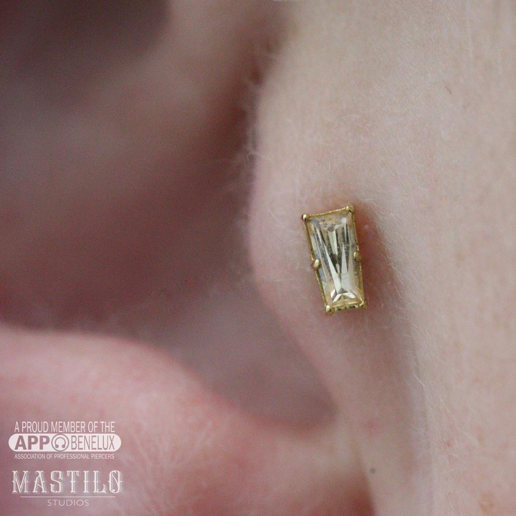 De 18k massief gouden Tapered baguette end is zoals alle sieraden van Anatometal met veel aandacht en precisie gemaakt, met de hand gepolijst en van topkwaliteit die levenslang gegarandeerd wordt. De afmeting van het sieraad is 2mm x 4mm.