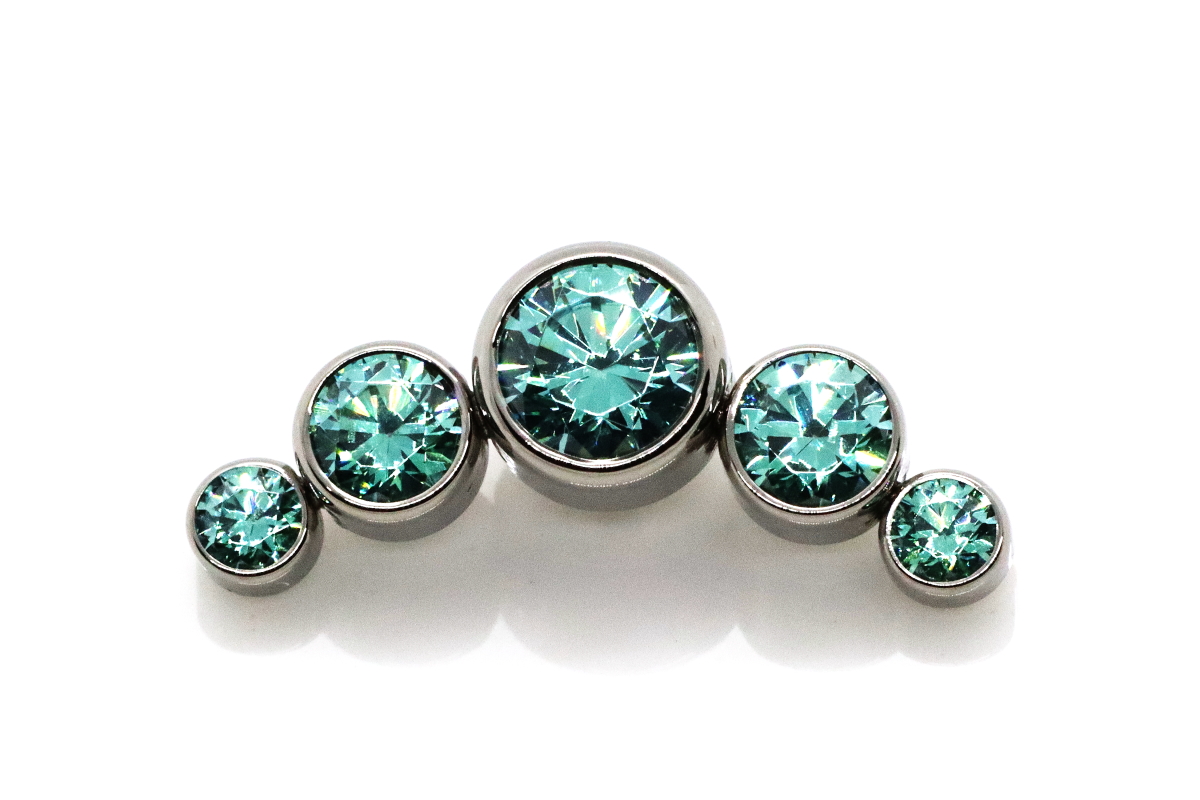 Dit sieraad is van ASTM F-136 implant grade titanium en zoals alle sieraden van Industrial Strength met veel aandacht en precisie gemaakt, met de hand gepolijst en van topkwaliteit die levenslang gegarandeerd wordt. Met de 5 bezel-set zirconia’s van 2.5mm/3mm/4mm/3mm/2.5mm vormt deze cluster een mooi sieraad voor een conch of een helixpiercing.