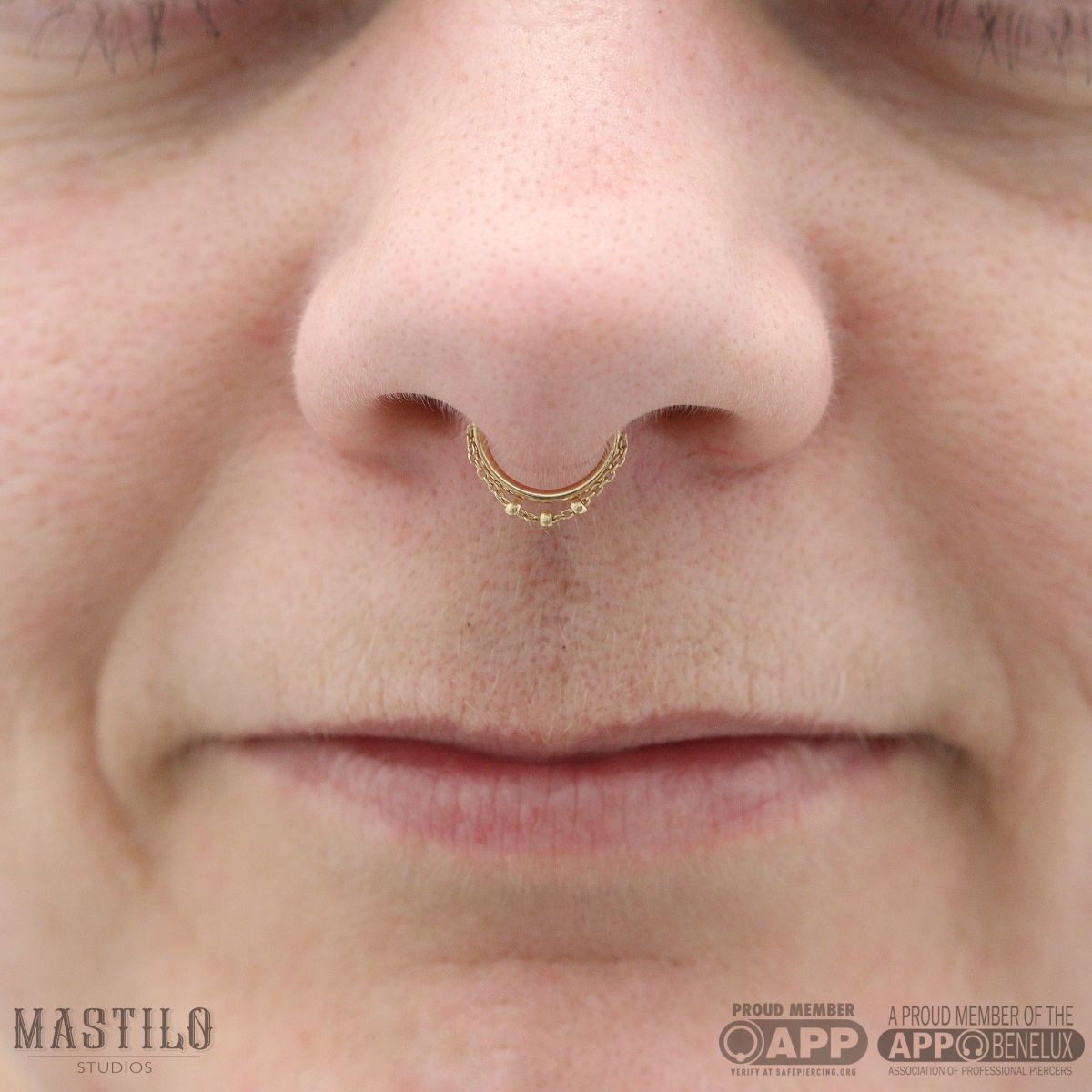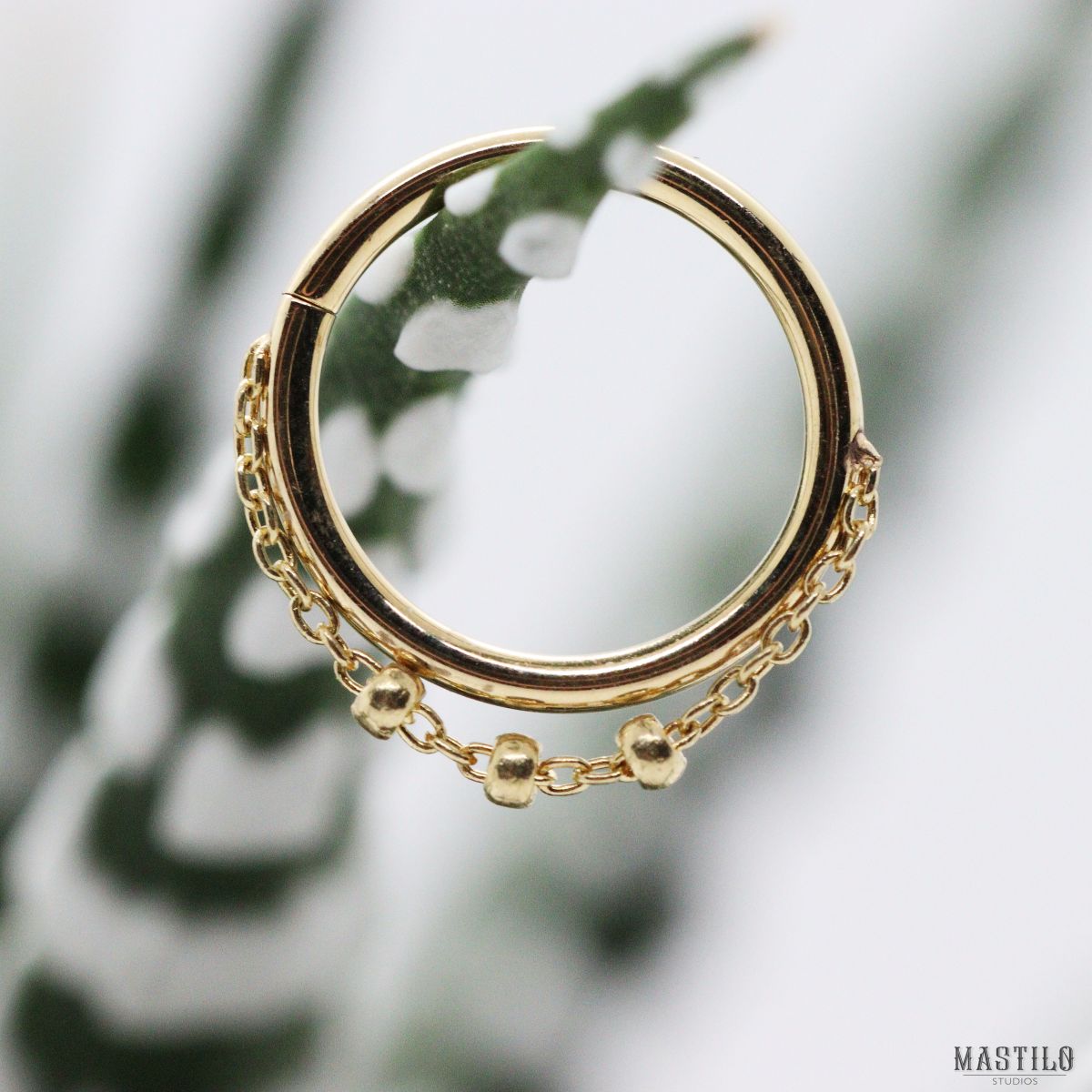 De klassieke seamring met een extra touch – een subtiele ketting die onder de ring loopt.